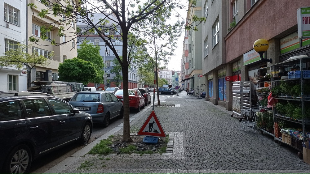 V ulici Kubelíkova se naproti lampě číslo 300 780 nachází zapomenutá přenosná dopravní značka "práce na silnici" označená vlastnickým štítkem firmy DAP.