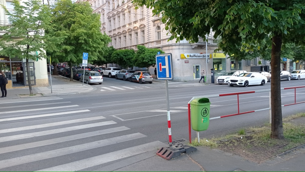Na křižovatce ulic Vinohradská a Nitranská se nachází zapomenutá přenosná dopravní značka "slepá pozemní komunikace vlevo."