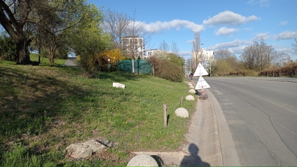 V ulici Malešická se přibližně uprostřed naproti lampám 301 926 a 301 925 nachází již dlouho zapomenutý podstavec po přenosné dopravní značce.