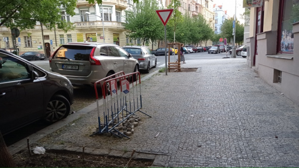V ulici Zvonařova se naproti lampě číslo 301 385 nachází dvojice zapomenutých kusů přenosného zábradlí označená štítky fy. DAP.