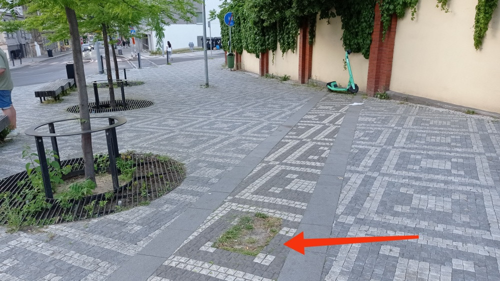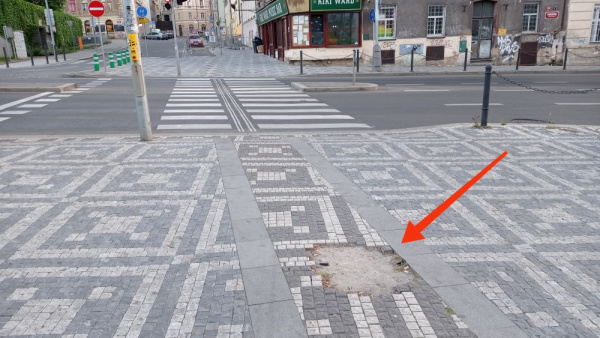 Na křižovatce ulic Prokopova a Rokycanova se před přechodem pro chodce u lampy číslo 300 879 nachází na dvou místech vedle sebe rozbitá dlažba chodníku.