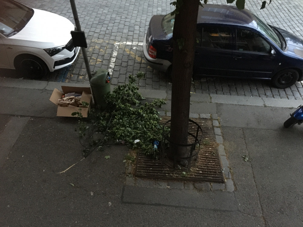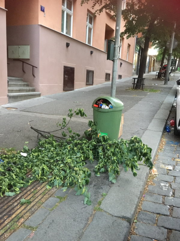 Po nocni bource spadla vetev, zaroven vedle preteka kos a jsou rozhazene odpadky, vc vyhozene papirove krabice. Vse po te bource.