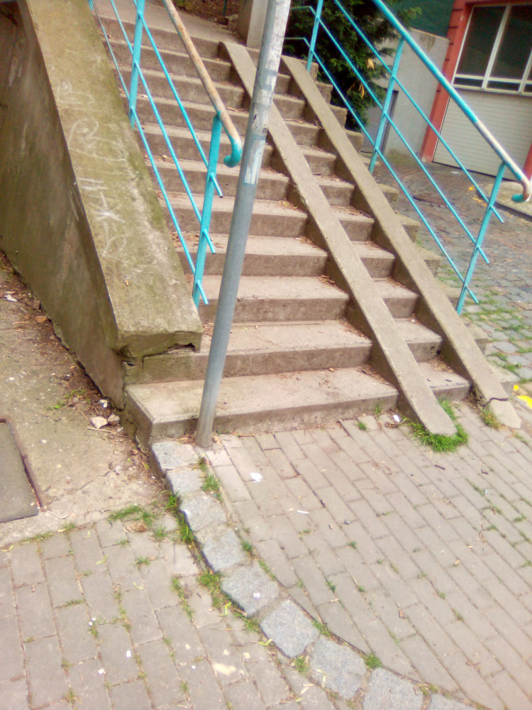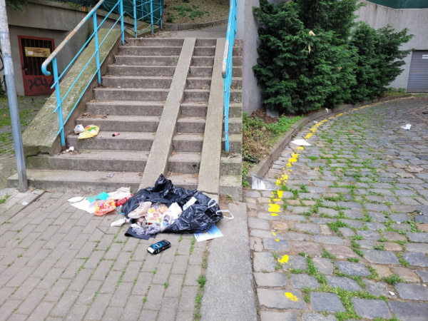 Pod schody na Parukářku v ulici Českobratrská někomu upadl pytel s odpadky, které poletují po okolí...