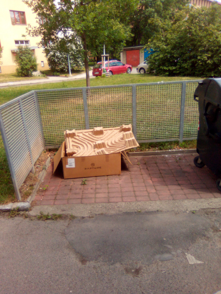 Pohozené kartony u kontejneru na směsný odpad.Děkujeme