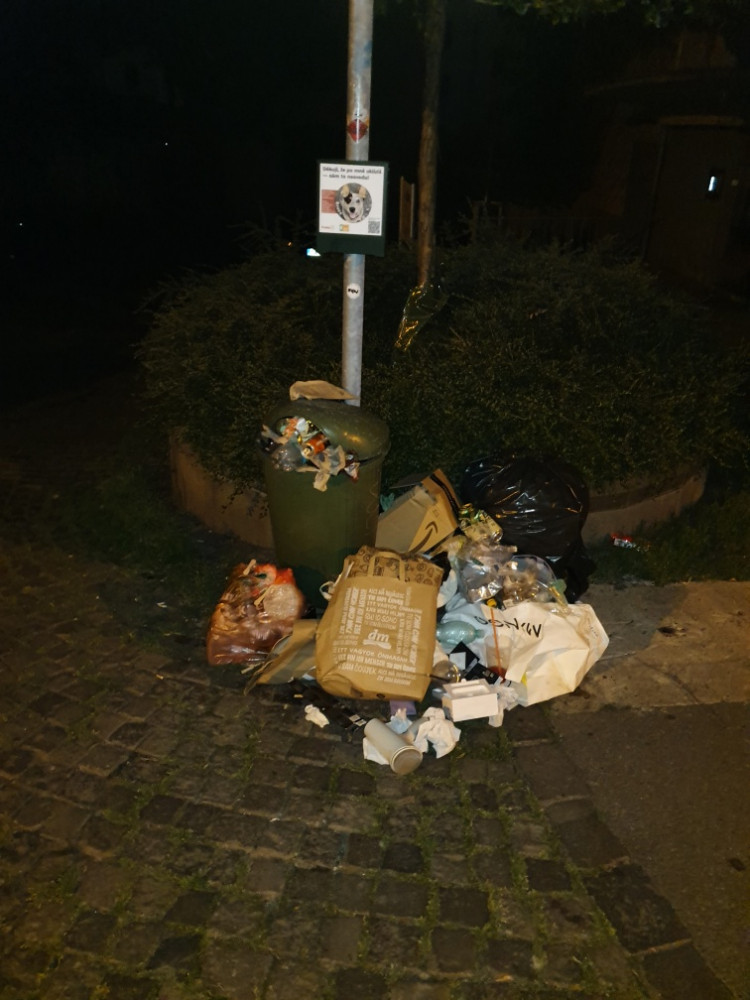 Plný koš a nepořádek okolo něj (další odpad) + opakovaně chybí pytlíky na exkrementy.