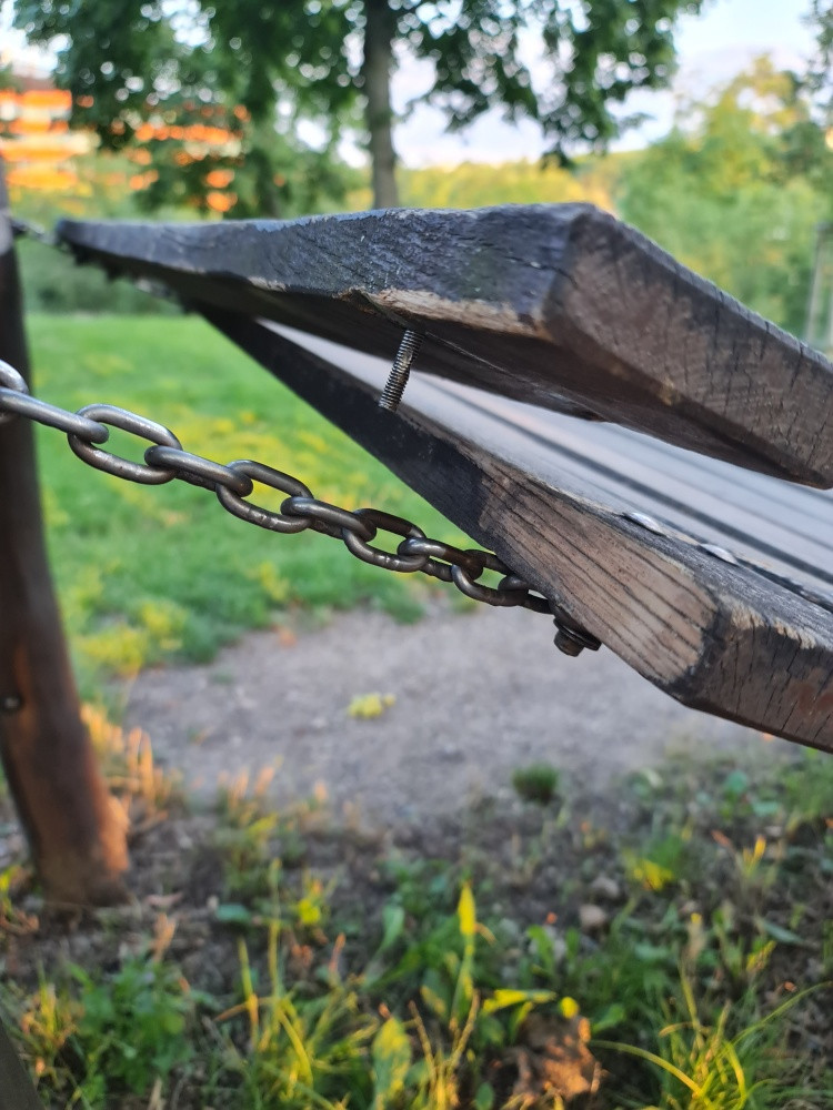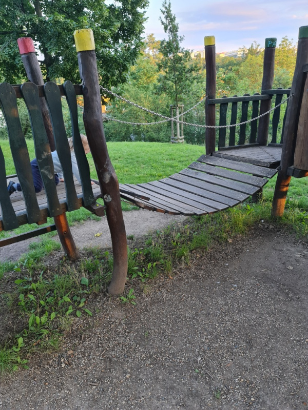 Rozbitá lávka na dětském hřiště.