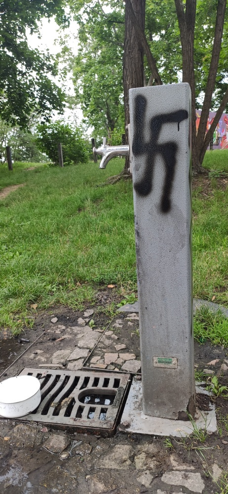 Odporná svastika na psím pítku opravdu není něco, co by se mělo vyskytovat v parku.