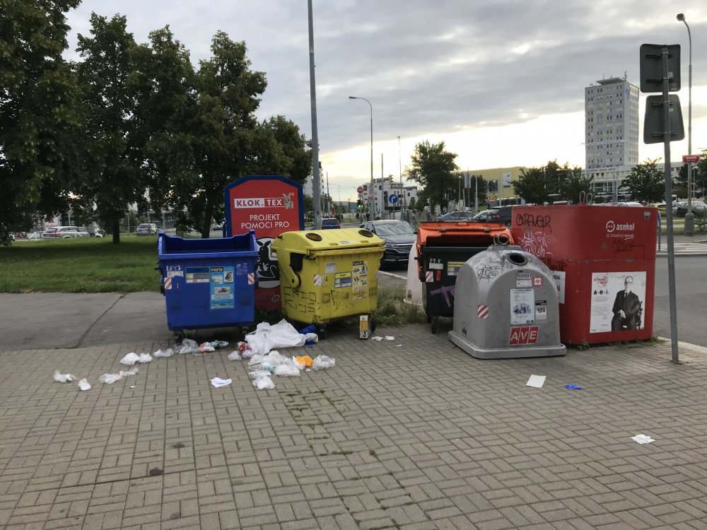 Nepořádek okolo kontejneru s plastem a papirem přímo proti prodejně albert na spojovací. Dekuji