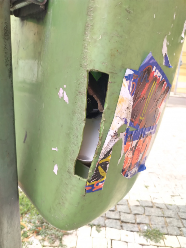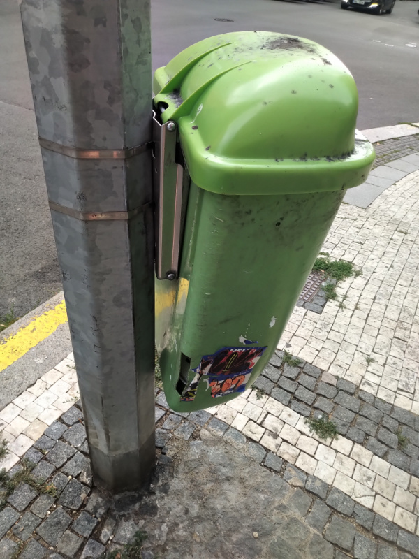 dobry den, na krizovatce ulic premyslovska a radhostska (u domu premyslovska 29) je rozbity odpadkovy kos - ma diru vespod a padaji z nej odpadky. pri pozorovani prazskych sluzeb, ktere kos vysypavaji jsem si vsimla, ze timto mistem bouchaji o rantl vozu - proto nejspis prasknul a cast se vylomila. prosim o opravu kose (asi by se ten plast dal nejak zazaplatovat) nebo jeho vymenu. dekuji