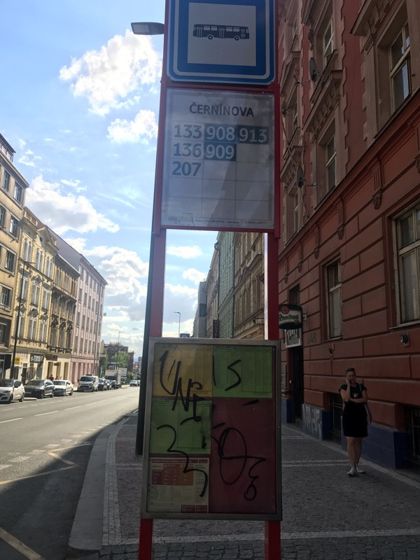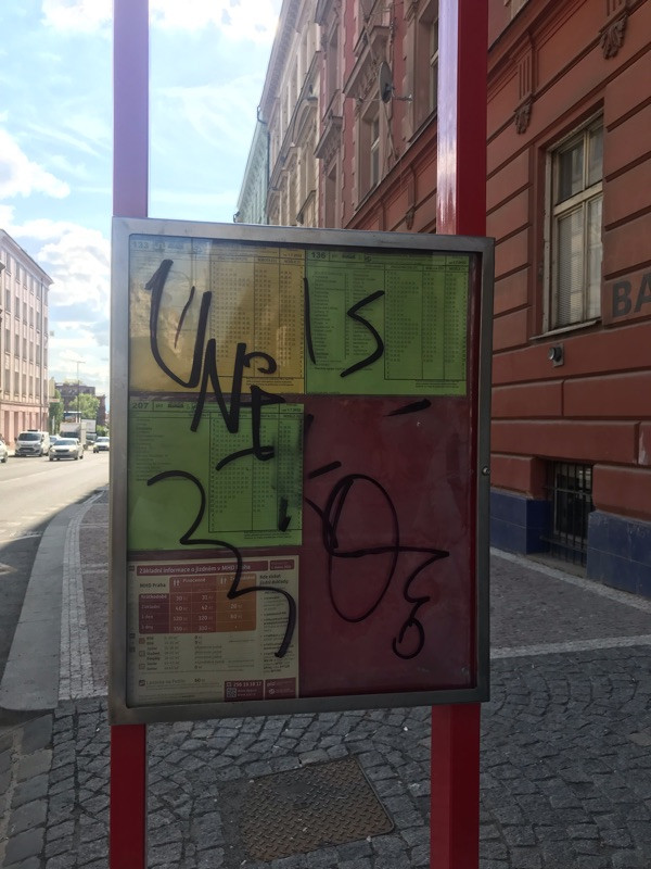 Prosím o vyčištění grafity na ceduli autobusové zastávky Černínova směr Florenc viz foto. Děkuji