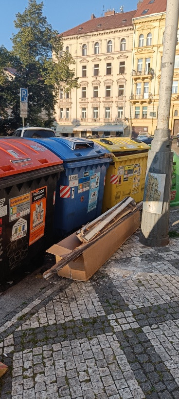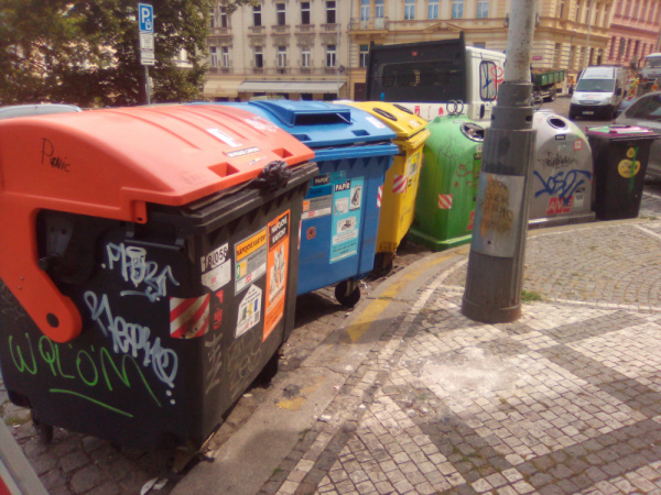 Nepořádek kolem popelnic na rohu Kostnického náměstí