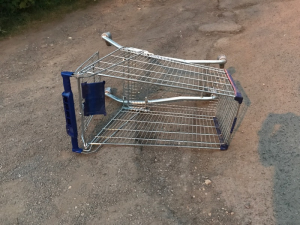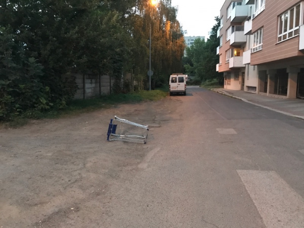 Válející se rozbitý nákupní vozík. Na ulici se povaluje již 14 dní.