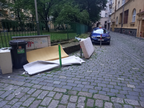 černá skládka nábytku ve vnitrobloku, za poslední noc opět přibyli další kusy - je zde tedy více kusů než na fotografii. Díky