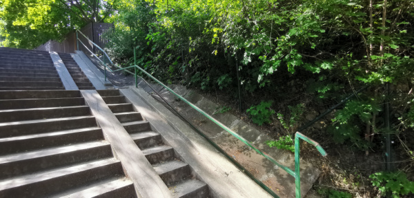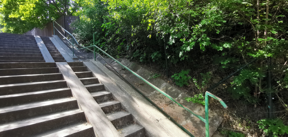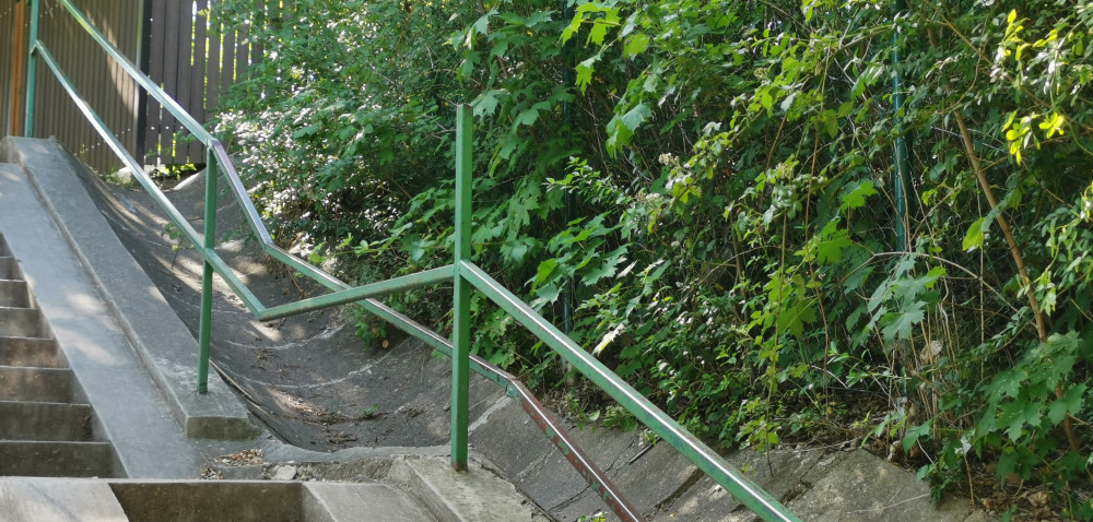 Poškozené/ utržené kovové zábradlí u schodů na východním okraji Židovských pecí. Nejbližší adresa Pod Lipami 1. Hrozí nebezpečí poranění chodců, dětí ap.