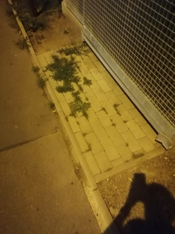 Travnaté plochy na vydlážděným chodníku. U klece s popelnicemi a před domem ondříčkova 383/31