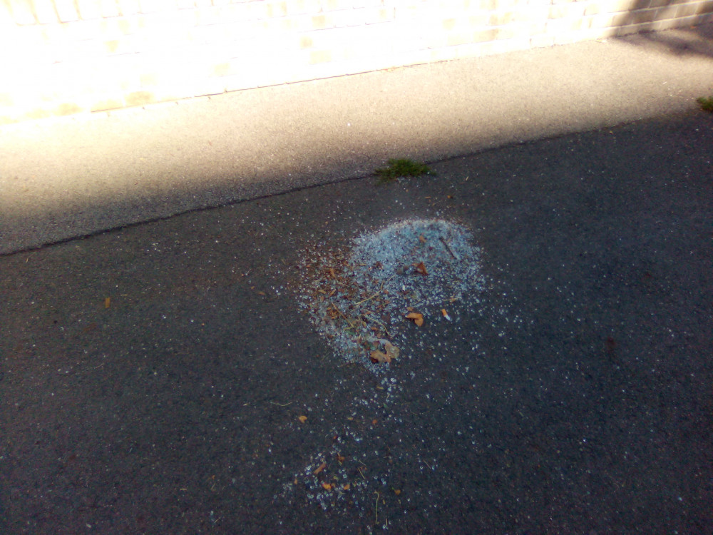 Rozbité sklo na chodníku a ve vozovce