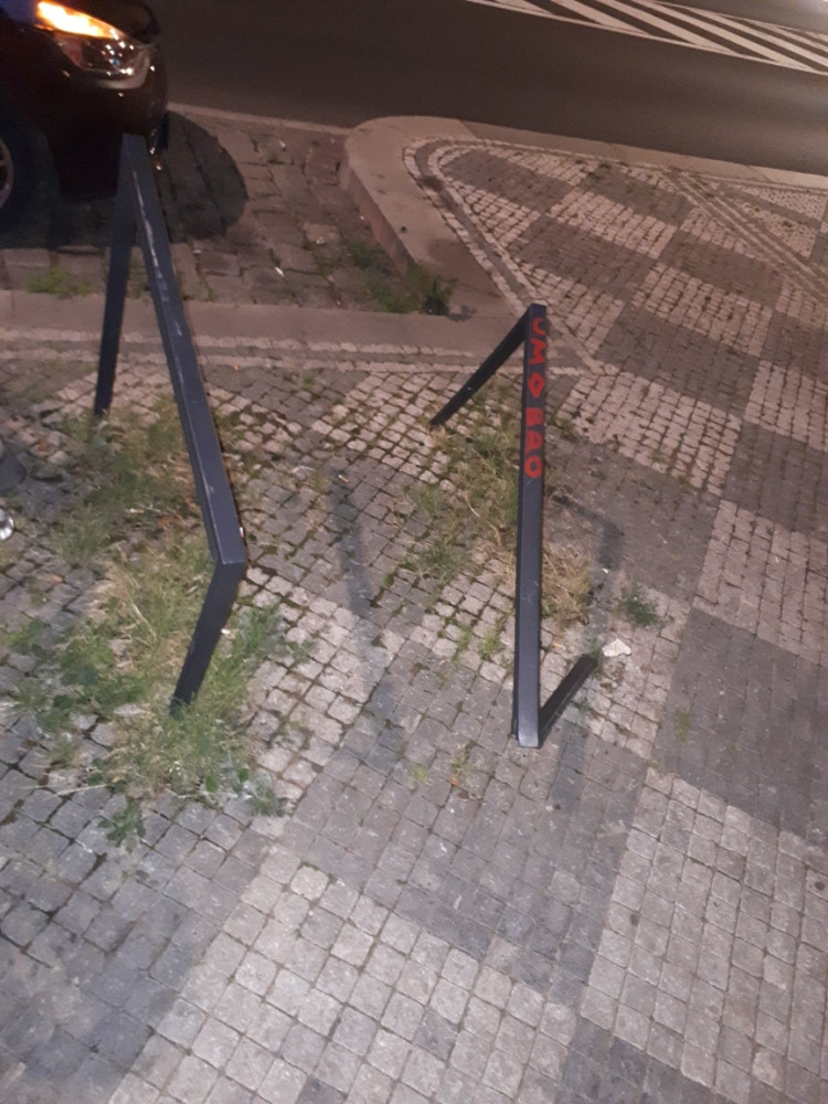 Ohnutý stojan na kola. Ve více osobách by to mohlo jít vyrovnat ručně.
