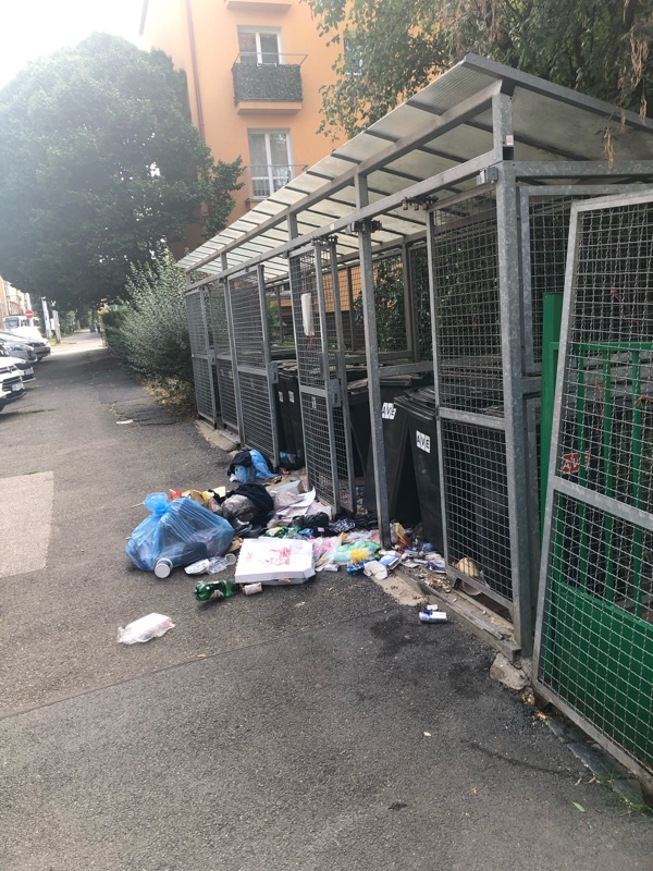 Nepořádek u odpadového hospodářství, vypáčené pojezdové brány, ul. Biskupcova, u Vozovny.