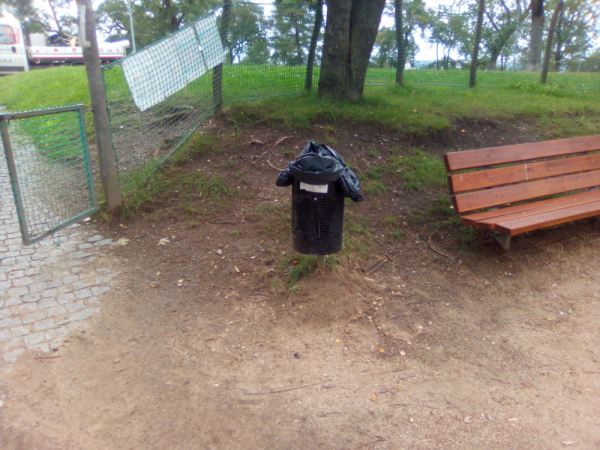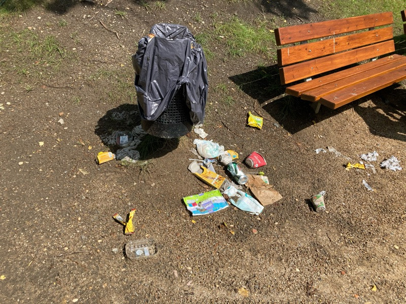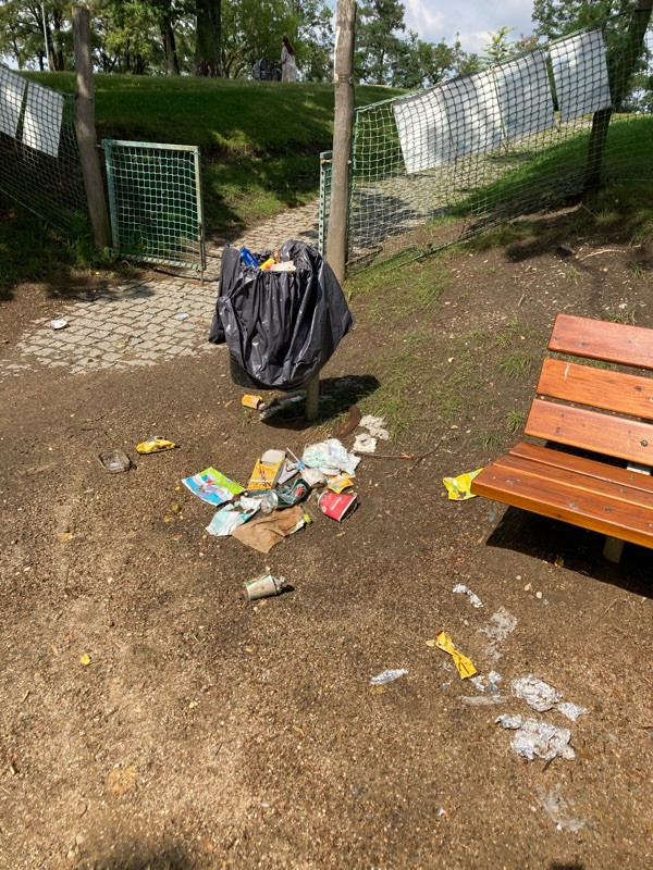 Odpadky kolem koše na dětském hřišti Písečná duna na Vítkově