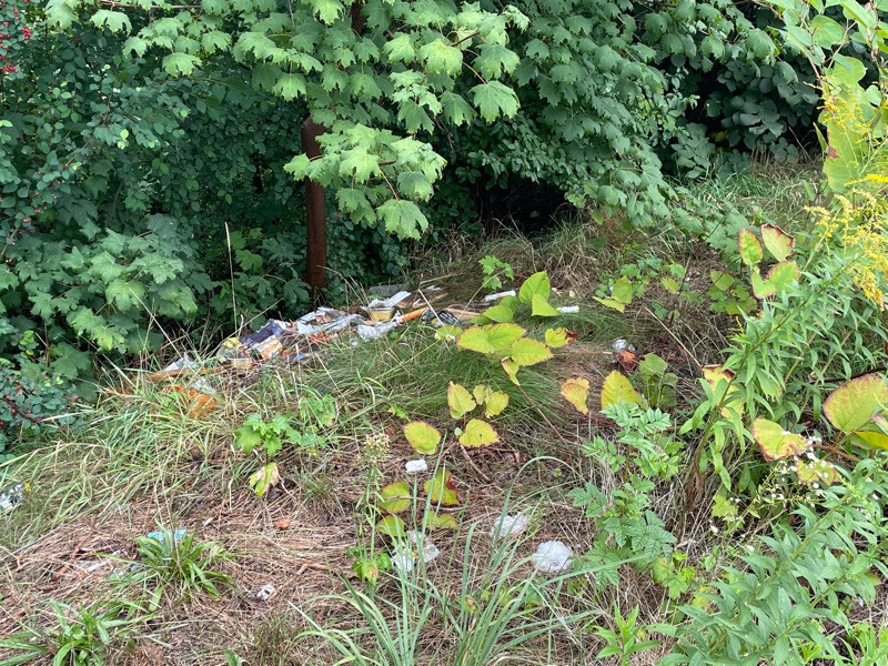V zeleni u kruhového objezdu a dál podél silnice U Nákladového nádraží je spousta odpadků.