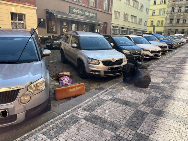 Odpadky na ulici a mezi zaparkovanými auty Husinecká před domem č. 17