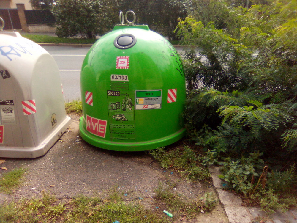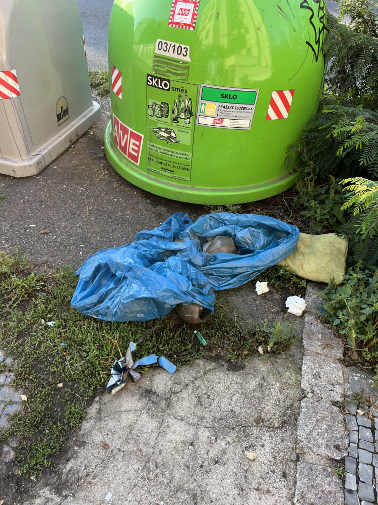 Pytel s odpadky u nádoby na sklo, ul. Soběslavská