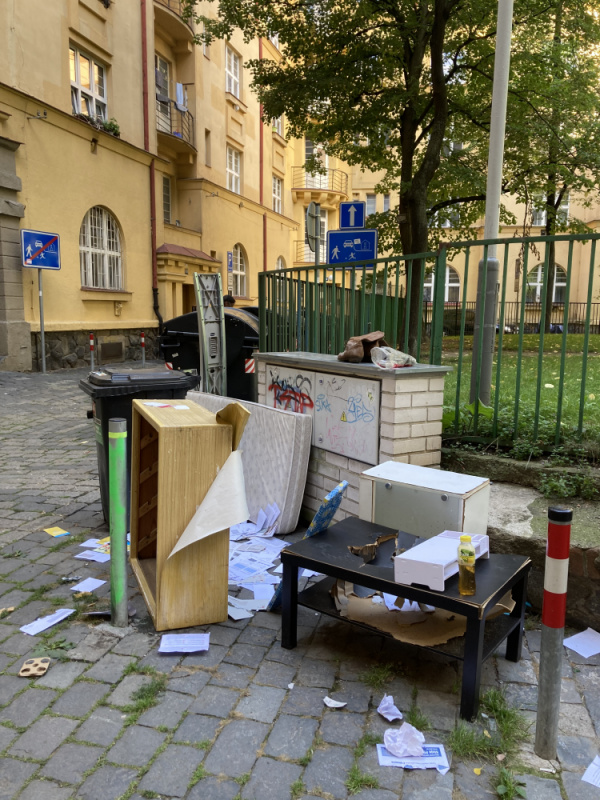 Dlouhodobý nepořádek kolem popelnic - buď z místa kolem lidé dělají sběrný dvůr a odkládají zde např. rozbité kusy nábytku, nebo popelnice chodí kdekdo vybírat a odpadky z nich vyhazují ven, ty pak roznáší vítr po celém vnitrobloku. Prosím (v součinnosti s místními SVJ) o uzavření popelnic do nějaké ohrádky/přístřešku či o prosté opatření zámkem, v každém případě není možné, aby byly přístupné zcela volně. Pomohla by možná instalace cedule varující před odkládáním odpadu patřícího do sběrného dvora.
