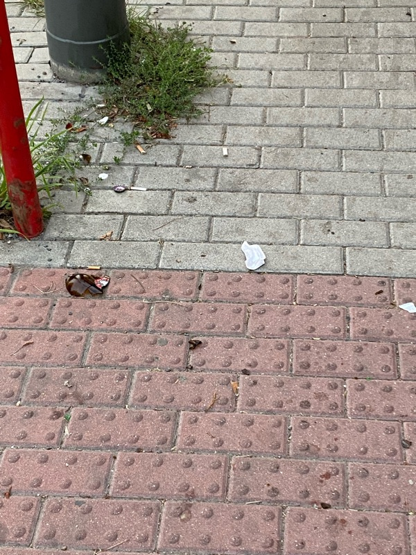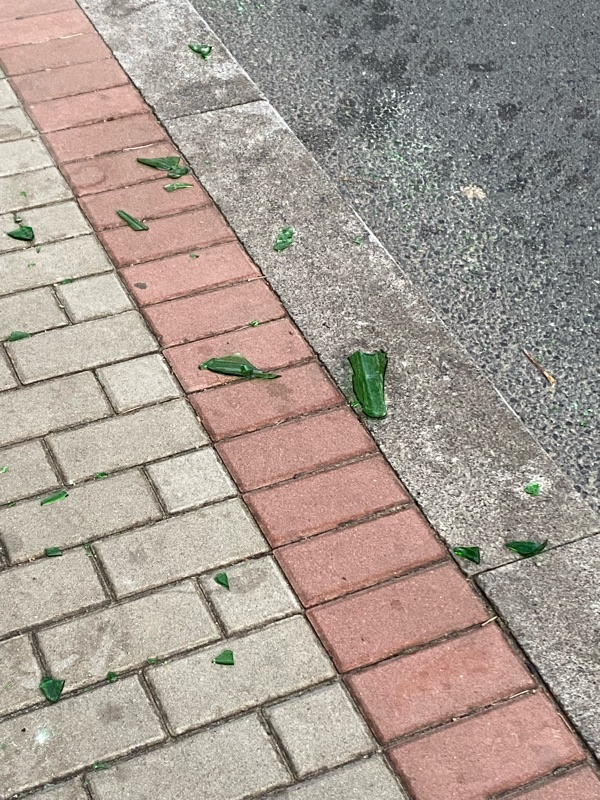 Střepy a odpadky. Od zastávky Vackov až k Penny. Děkuji.