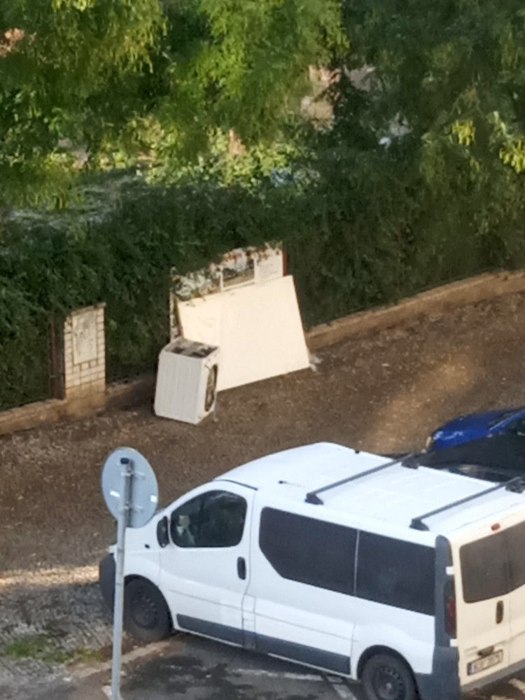 Odložená pračka a dřevěná deska u plotu "mateřské školy Jeseniova"(teď tam není školka je tam jen pozemek)odpad se nachází kousek od kontajneru na tříděný odpad