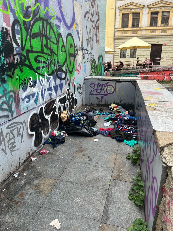Rozhazene odpadky a obleceni na Tachovskem namesti
