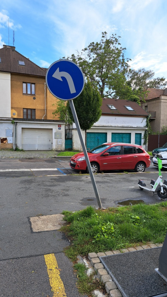 Ohnutá dopravní značka, Jeseniova/Hořanská.