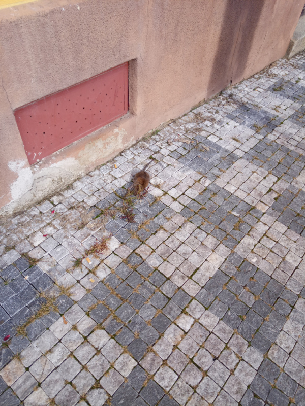 chodník před Rokycanova 15, ještě teď tam chudák nafouklej ležel, možná už má jinou podobu :-)