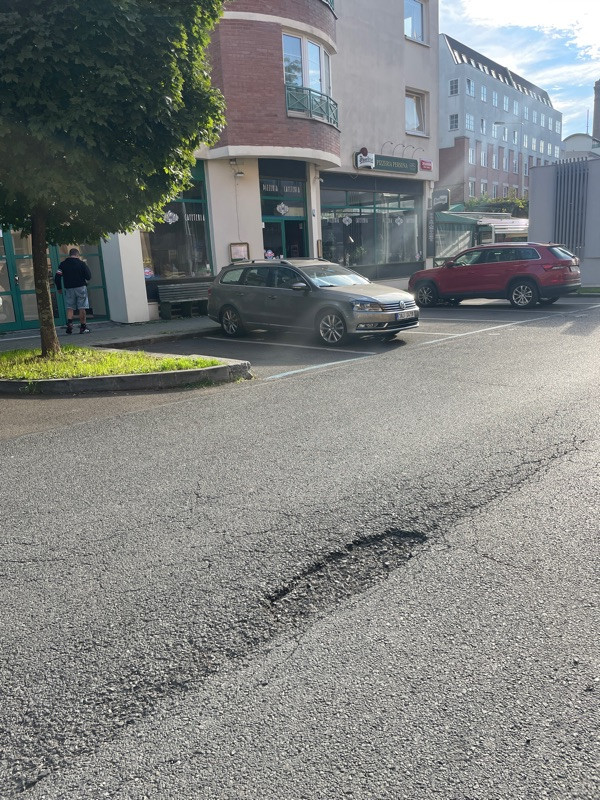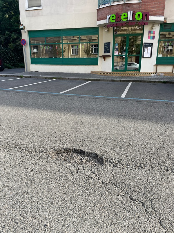 Stále se zvětšující 2 výmoly v komunikaci, cca 50m od sebe. Odletující kamínky z výmolů poškozují zaparkovaná auta.
