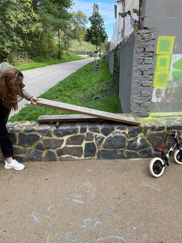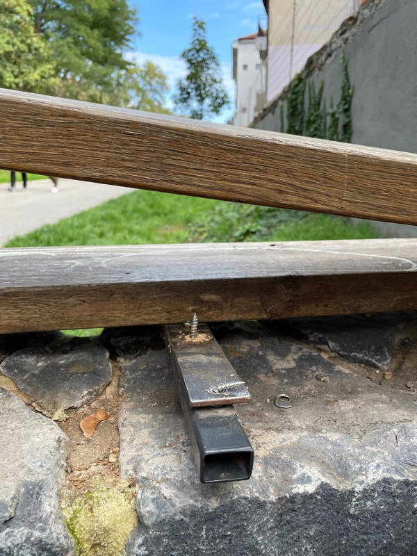Rozbita lavicka u trampolin, zespodu koukaji ostre srouby