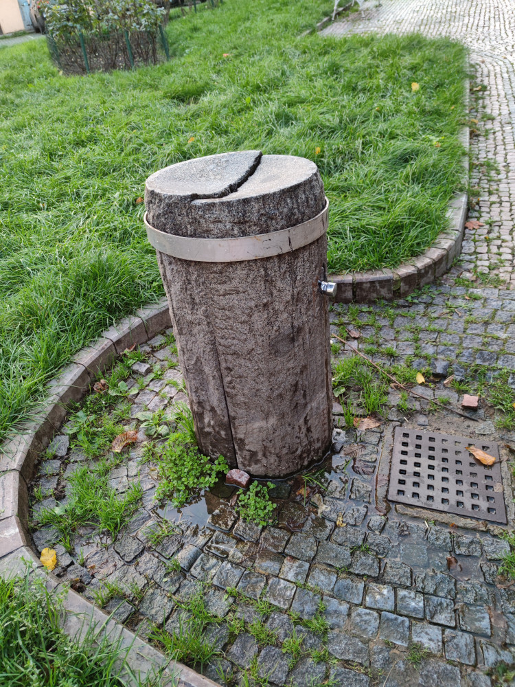 Pítko na Sladkovskeho náměstí stále protéká a je rozbité. Voda teče do kanálů.