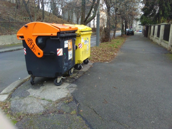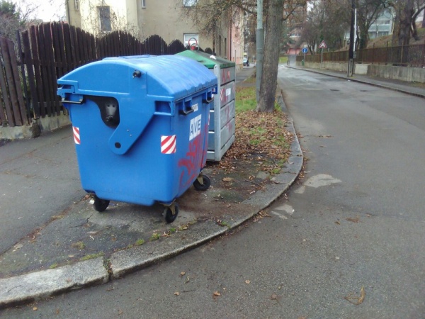 Velký nepořádek u kontejnerů, které byly právě vyvezeny. Roh ulicí Pod Lipami a Schöfflerova