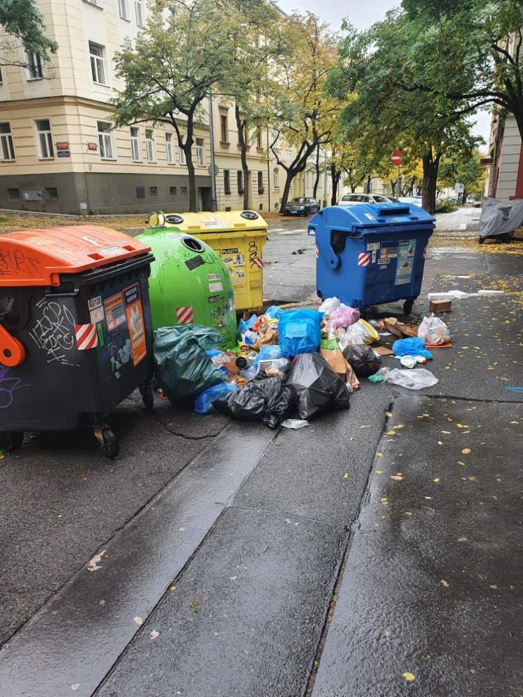 nepořádek na místě zůstal právě po pravidelném svozu. Všechny kontejnery byly prázdné, ale nepořádek kolem zůstal.