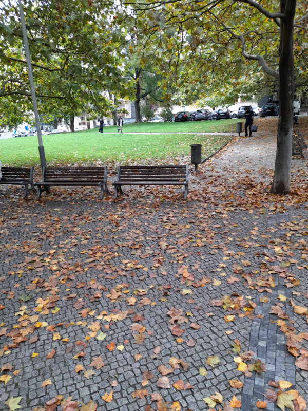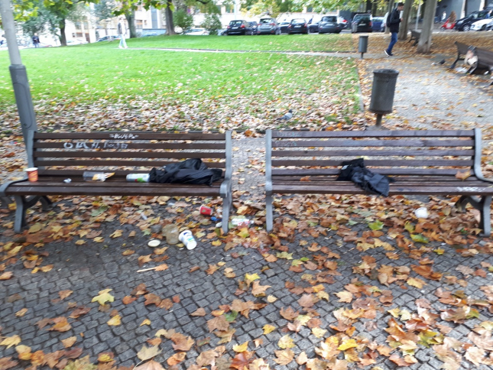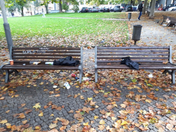 Odpadky na lavičkách na v parčíku na nám. W. Churchilla.