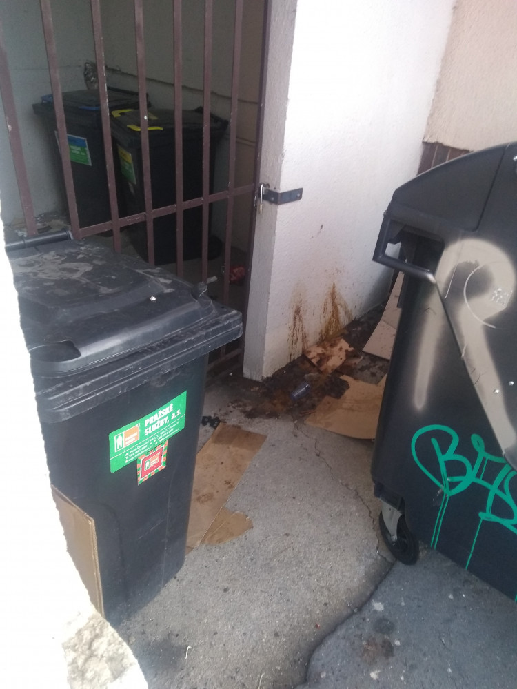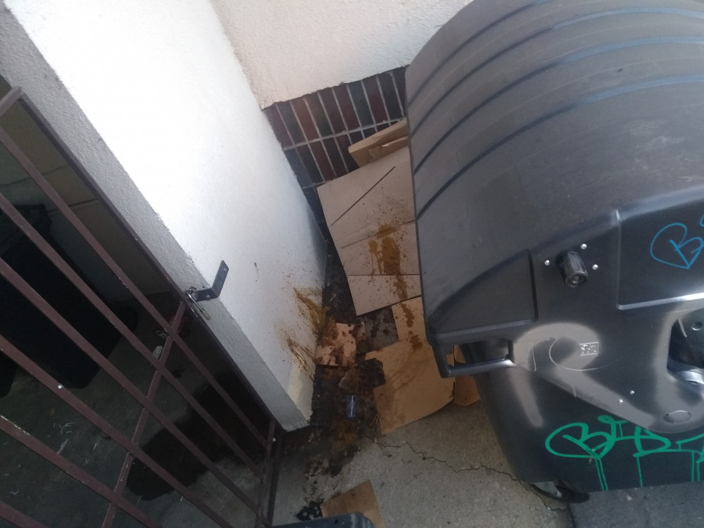 Na rohu u Riapsu u popelnic je místě silné zaneřáděné. Páchne to tam exkrementy.