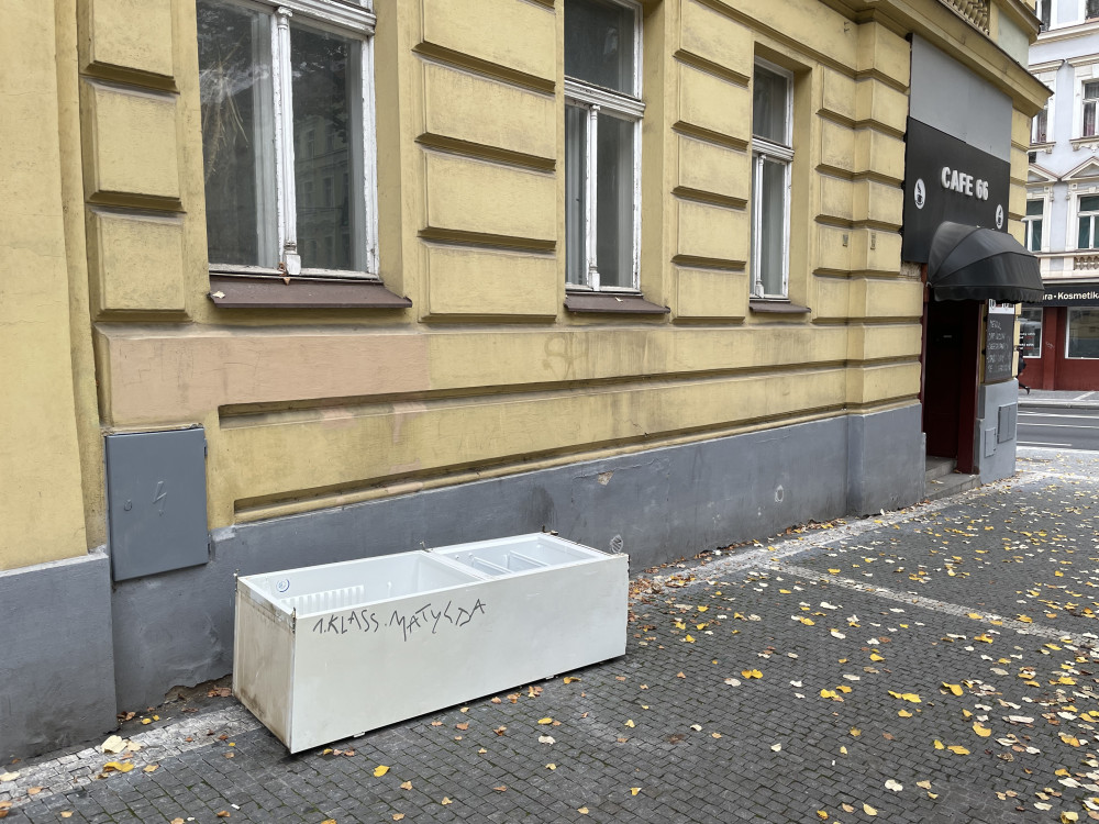 Vyhozena stará lednice na ulici Černínova.