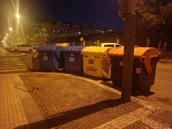 Nešlo by prosím požádat příslušnou správu, aby po vyvezení těchto kontejnerů je otočili tak, aby se dali odpadky vyhazovat ze strany, kde se nachází chodník? Když se tam motají lidi na silnici vyhazující tříděný odpad, tak o nich řidiči přijíždějící z Chrudimské do Slezské nemají šanci vědět a je to docela nebezpečné pro chodce i řidiče. Děkuji.