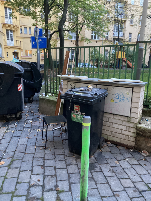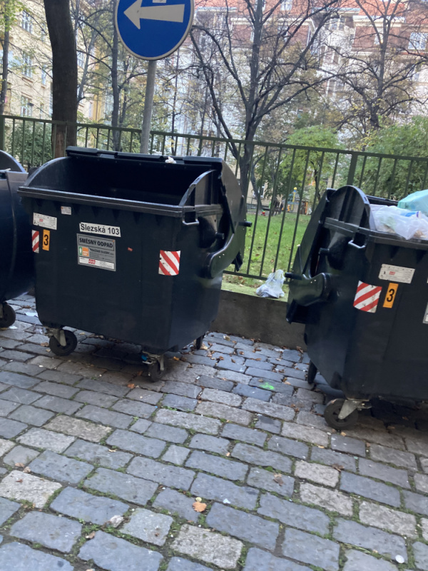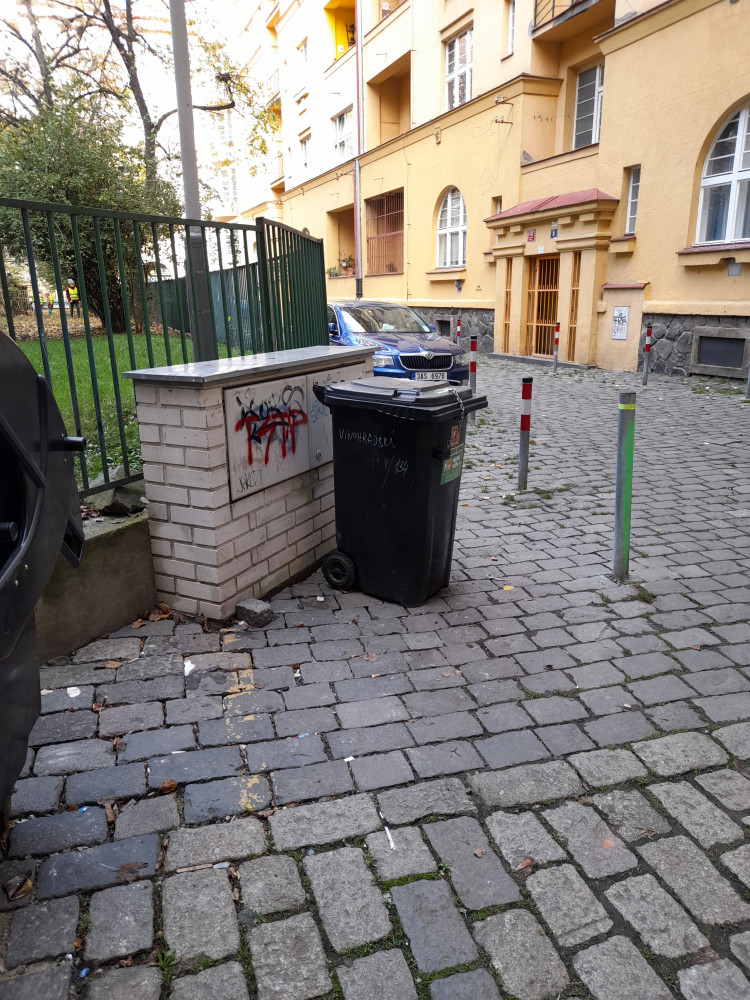 Opět černá skládka a nepořádek kolem popelnic a v přilehlém průjezdu ve vnitrobloku Jičínská. Dokud nebudou popelnice zabezpečené, může se Čistá trojka jezdit denně.