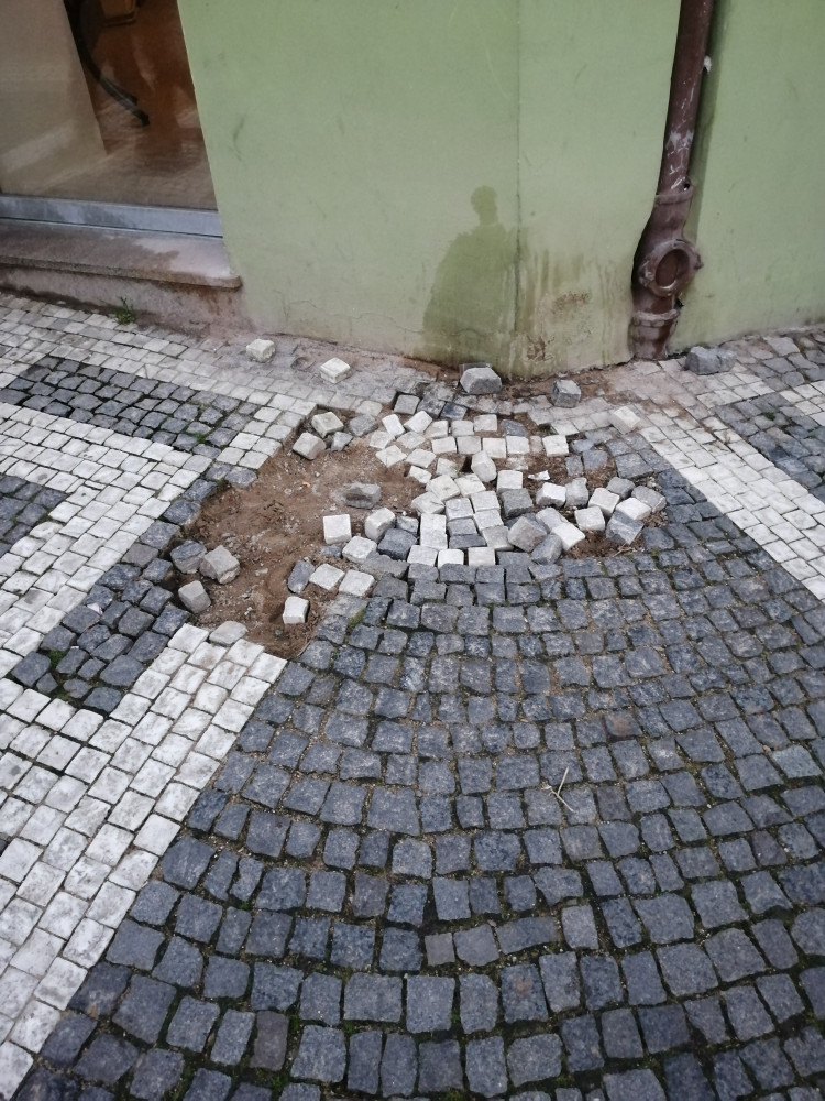 Postupně mizející kostky v místě, kam teče ze střechy (a voda tak odplavuje písek držící kostky na místě...). Roh Bořivojovky a Čajkovského (ten nejblíž ke kostelu).