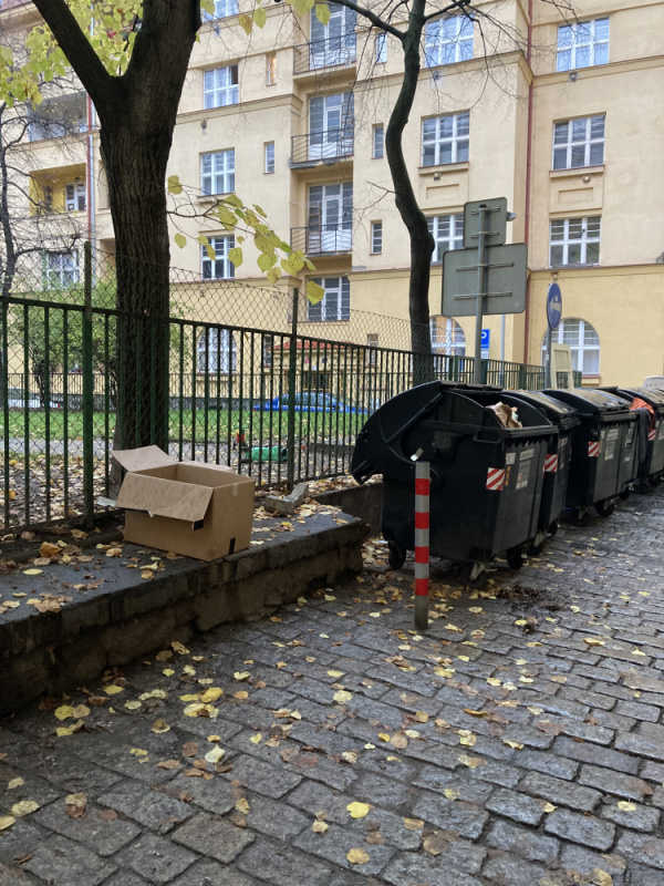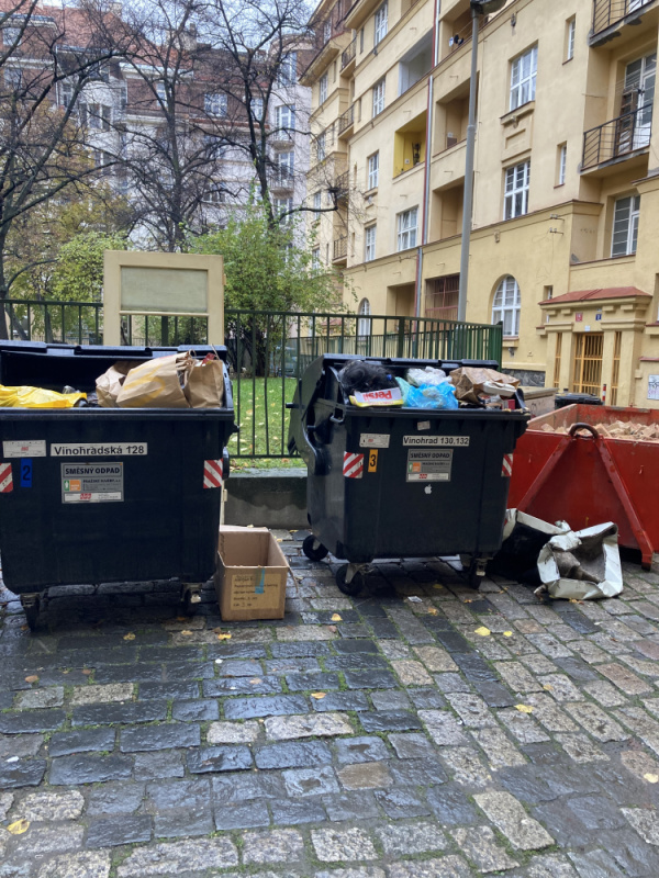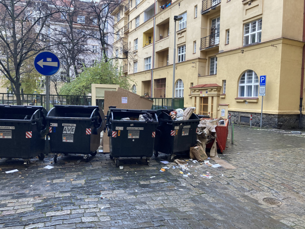 Opět nepořádek kolem popelnic. Prosím i o úklid odpadků rozfoukaných po celém vnitrobloku, zadní části (sousedící s popelnicemi) dětského hřiště a obou průjezdech. Na odpadky si chodí pochutnávat potkani.
