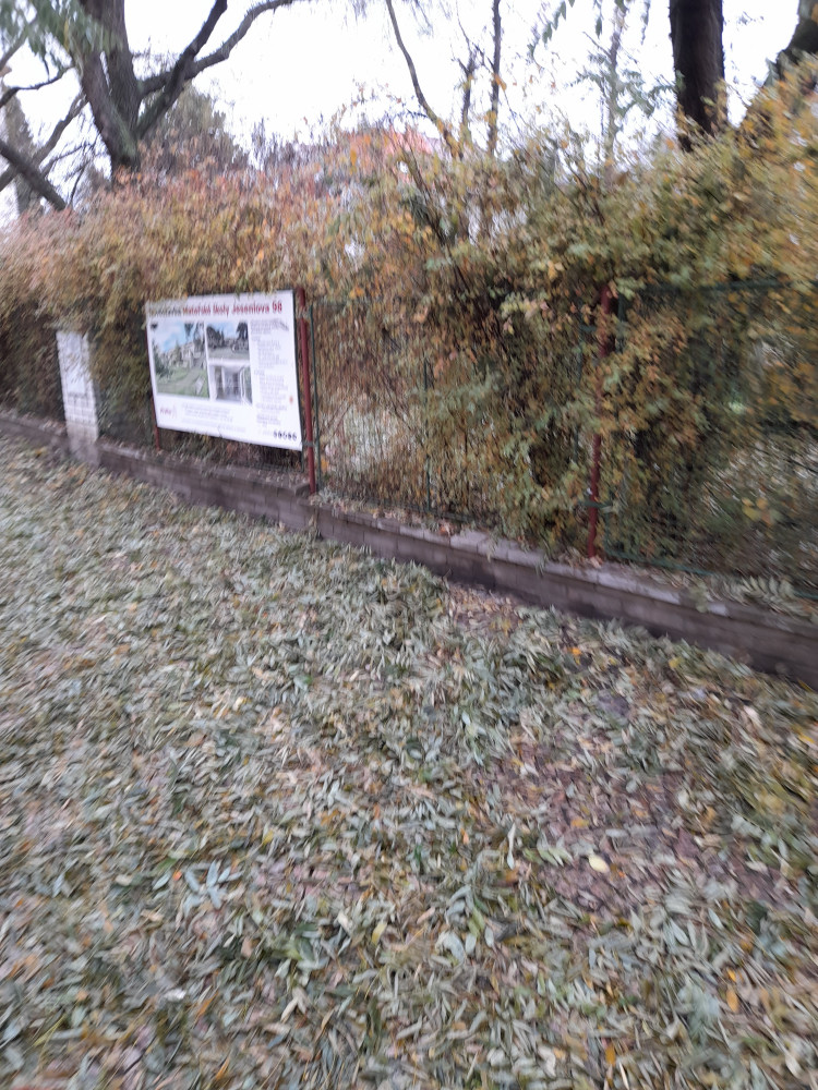 Vyhozená sedačka u plotu bývalé mateřské školy roh Jeseniova a Ambrožova