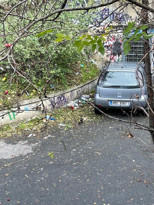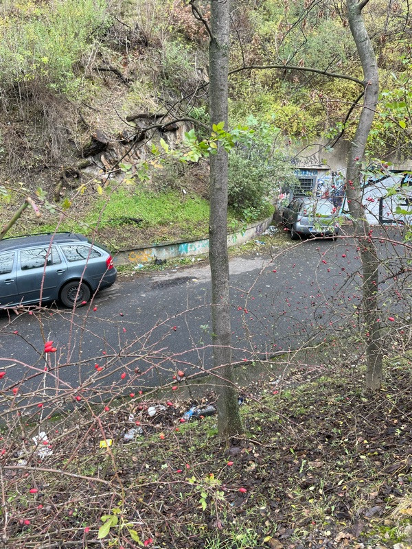 Rozhazene odpadky take o neco nize u vchodu do krytu a po celem “parkovisti”