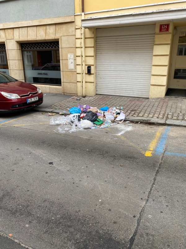 Rozsypane odpadky na miste, kde standardne byva kontejner