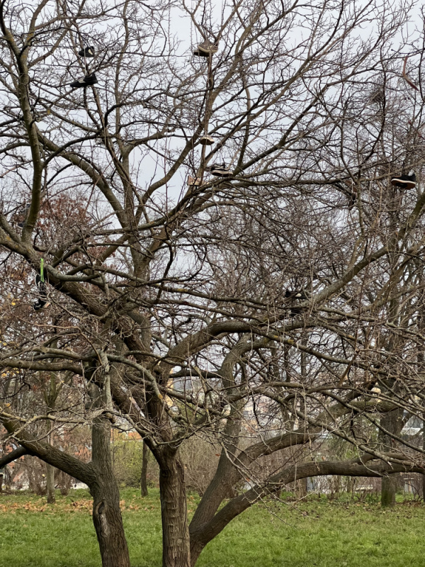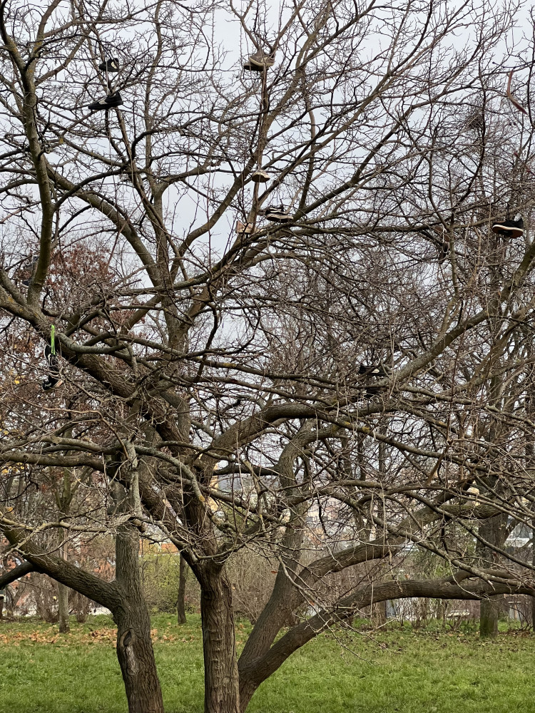 Při ošetření stromů na Židovských pecích pomocí plošiny, lze vyřešit i Vás požadavek na odstranění několika párů bot ze stromu.
