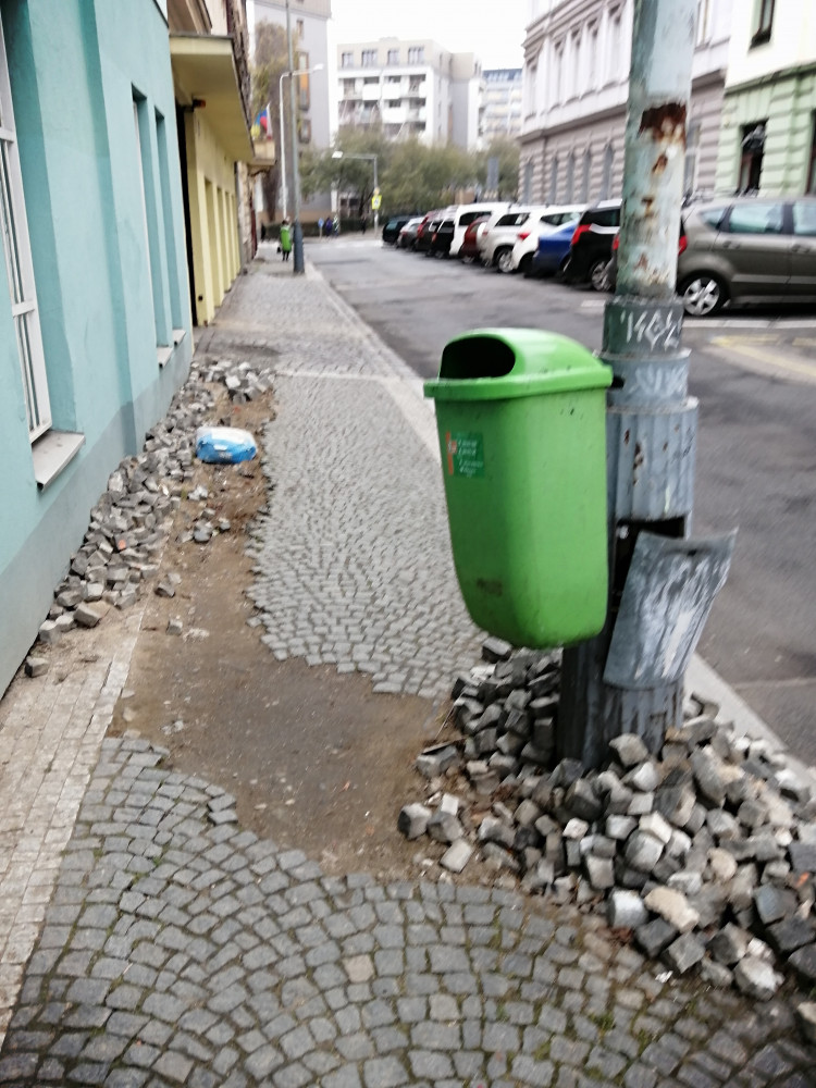 Hrozný stav chodníku v Sabinově ulici - po vykopech byly odstraněny kovové zábrany a můstky, ale zůstaly díry v chodníků, hromady kostek, hromady odpadu, i nějaký pytel s č>msi.