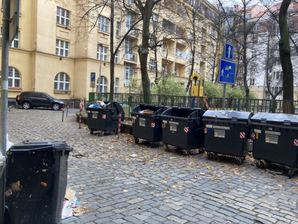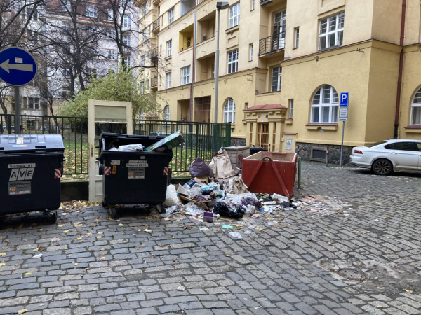 děkujeme za Váš podnět. Za popelnice na komunální odpad, i za jejich okolí a udržování pořádku je zodpovědný jejich vlastník, což je většinou majitel či SVJ příslušného domu... Na uvedené místo nicméně zajedeme tento týden poklidit,